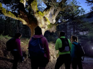3. El regreso nocturno. Con la caída de la noche, iniciaremos el camino de regreso. Los olores del bosque cambian, los sonidos se intensifican y el silencio adquiere protagonismo. Caminaremos bajo la luz de la luna, escuchando la vida nocturna de la naturaleza y sintiendo la brisa de los senderos que nos conducen de nuevo al punto de salida.